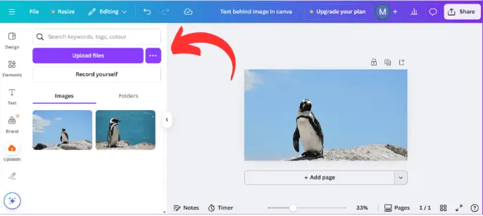 - Click Upload files, select your image and Canva will add it to your library.